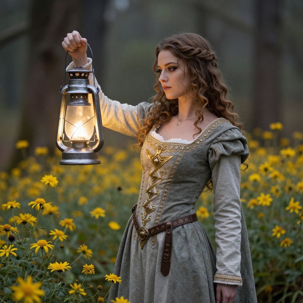 Elegant woman in medieval-inspired attire holds a glowing lantern amidst a forest setting, surrounded by vibrant yellow flowers and intricate details of her costume, evoking themes of myth and magic.