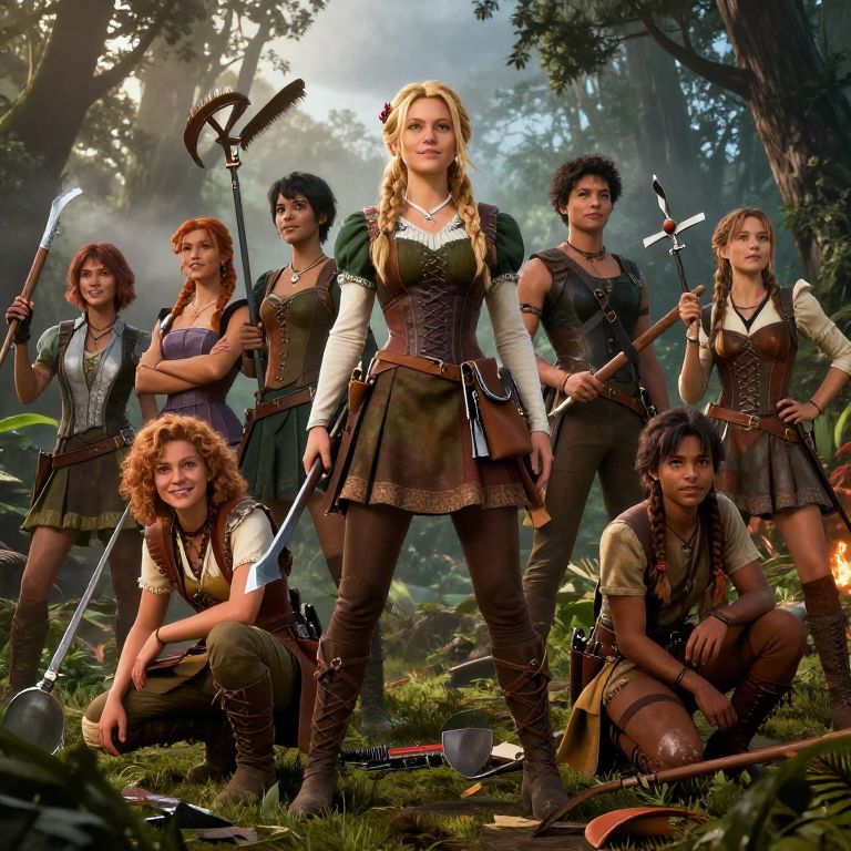 This is a digitally created fantasy image featuring seven women standing and kneeling in a dense forest. The central blonde woman with braided hair wears a green dress with a brown corset, white sleeves, and brown boots. Surrounding her are women with various hair colors and styles, dressed in medieval-inspired outfits with leather and metal accessories. They hold weapons like swords and axes. The background shows tall trees and sunlight filtering through the foliage, with a misty atmosphere. The women have different skin tones and are depicted with strong, determined expressions. The ground is covered in grass and scattered with tools and gear.