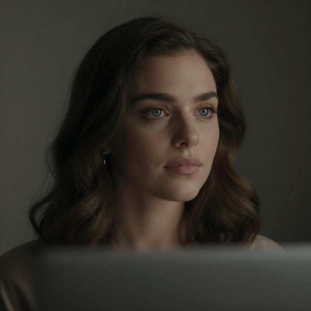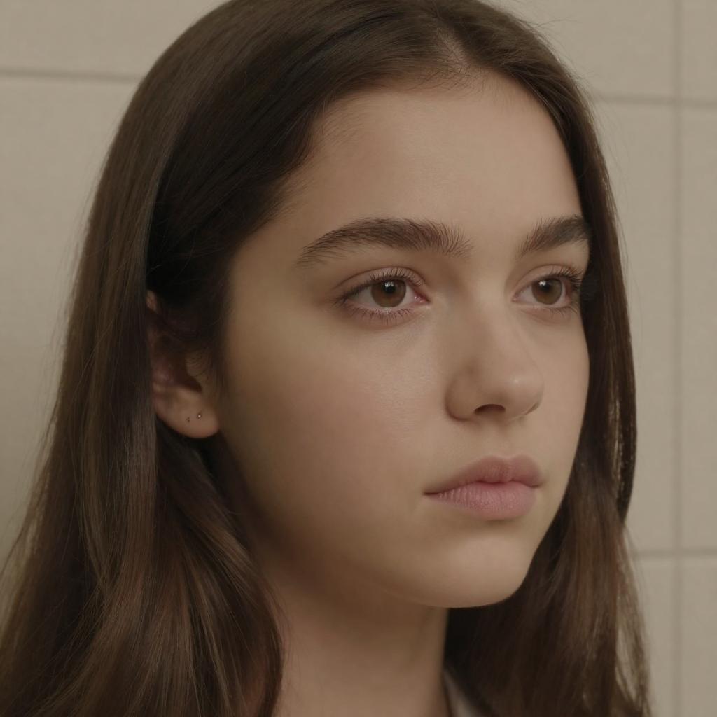 Photograph of a young woman with fair skin and brown hair in a ponytail, wearing a pale pink sleeveless top. She holds a makeup brush to her cheek, looking upward with an intense expression. Partially visible dark figure in the foreground. Dimly lit room with dark and brown walls in the background.