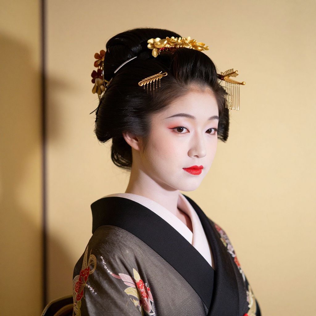 A traditional Japanese woman with intricate hair styling and delicate makeup, wearing a kimono, in a beautifully lit studio setting with soft shadows and professional color grading.