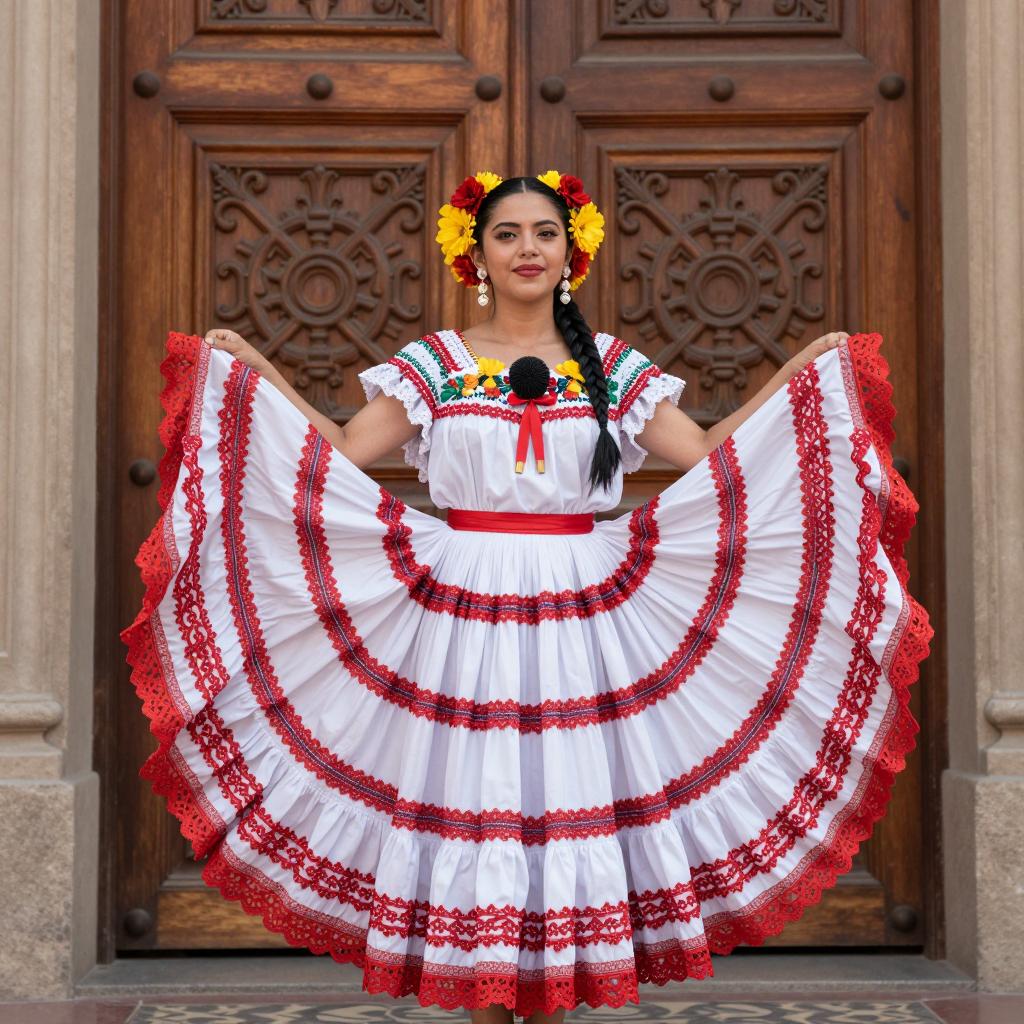 Photograph of a young woman standing in a narrow street wearing a traditional Mexican folk dress. The attire is a white long-sleeve dress with colorful red, yellow, and green floral embroidery, accented by a yellow sash at the waist and a wide-brimmed straw hat decorated with white and red flowers. She has braided dark hair and is wearing brown sandals. The background features warm sunlight illuminating orange-pink buildings, creating a casual and cultural atmosphere in a modern street setting.