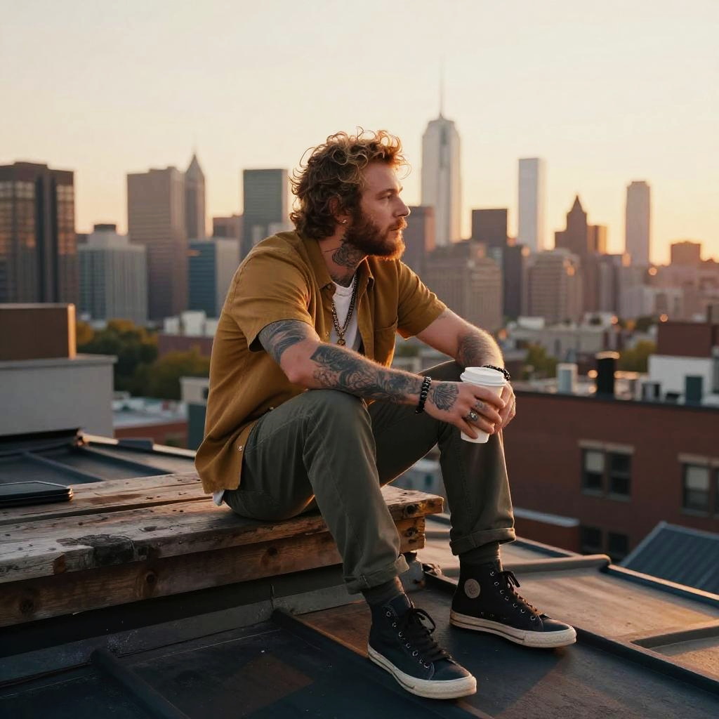 Post malone tall sitting on a rustic rooftop at sunset, overlooking a sprawling city skyline, wearing layered casual clothes, holding a cup of coffee, contemplative mood, warm golden light, detailed urban textures