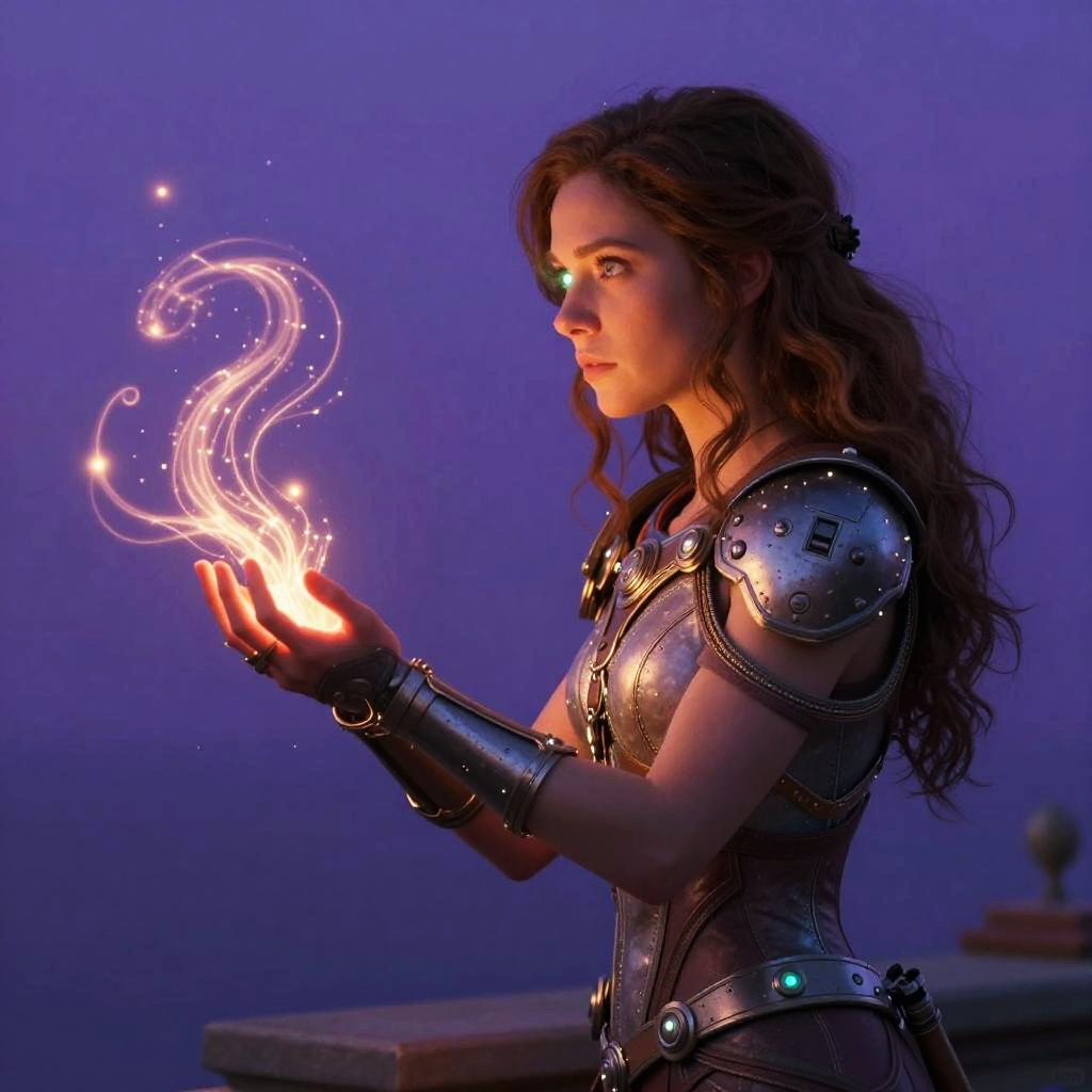 (ambient lighting:1.2), (volumetric lighting:1.2), (fine details:1.1), photorealistic, depth of field, 1 girl, adult ukrainian woman, grey eyes, medium brown wavy hair, focus on character, solo, (style-swirlmagic:0.8), from side, side view, half shot, detailed face, webbedtech themesolar enchanter, (glowing eyes:1.1), (undaunted bravery, :1.05), perched on a ledge, mantle, harnessing ethereal strands of energy, mind-merge devices enhancing cognitive abilities, (simple purple background:1.0)
