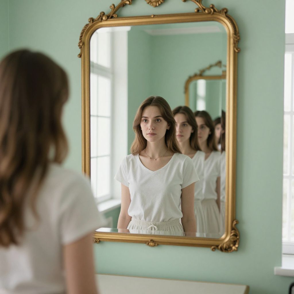 Woman stands before a gold-framed mirror in a serene, mint-green room, her reflection nested within another mirror, creating an infinite loop of echoes against the backdrop of soft natural light streaming through a window.