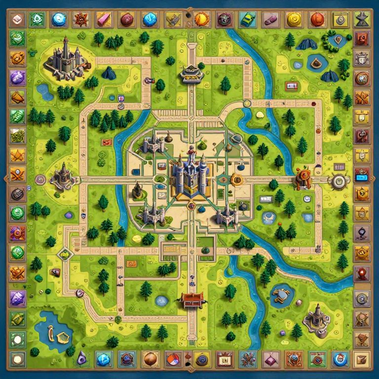 Game board layout with intricate medieval fantasy map, vibrant colors, detailed terrains, castles, rivers, forests, and thematic icons, top-down perspective, high resolution