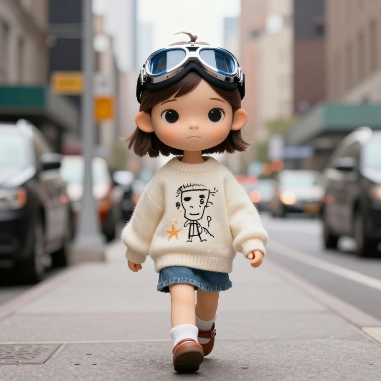 Photograph of a brown-skinned, cartoon-style girl with brown hair, white shirt, red skirt, and bow, standing on train platform with arms