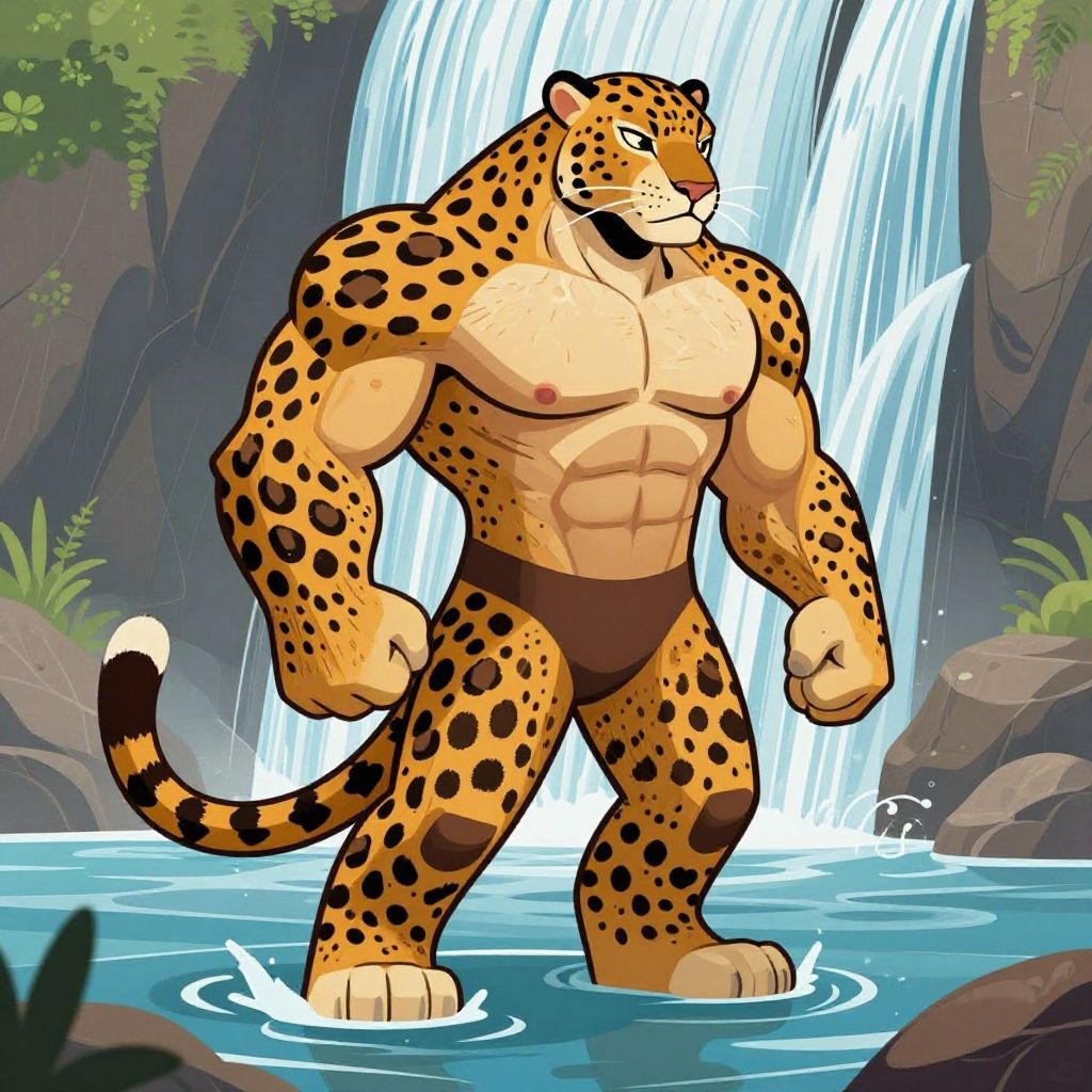 Digital illustration of a muscular anthropomorphic leopard with exaggerated muscles, standing in water near a waterfall. The figure combines human bodybuilder physique with leopard features, including spotted fur, tail, and feline face. The background shows cascading waterfalls and rocks, with green foliage on the side.
