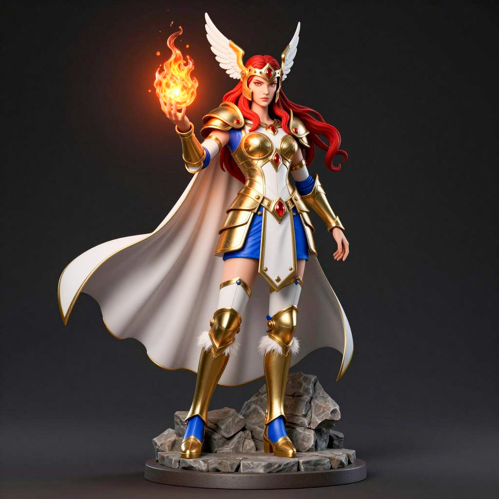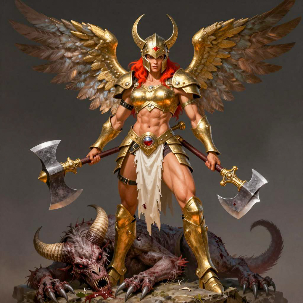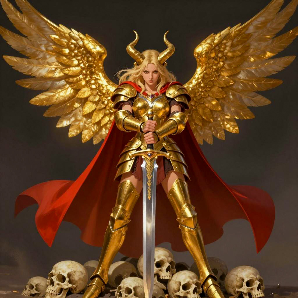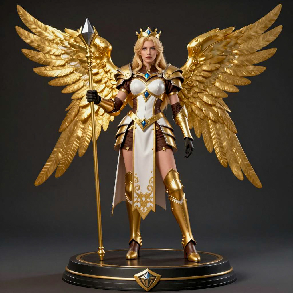 Digital illustration of a woman in golden winged armor, standing with wings spread. She has dark hair, wears a golden helmet, and has a serious expression. Her armor has intricate patterns and metallic ures. She stands on a circular base with a golden "W" at the bottom. Her arms are straight, and her feet are slightly apart.