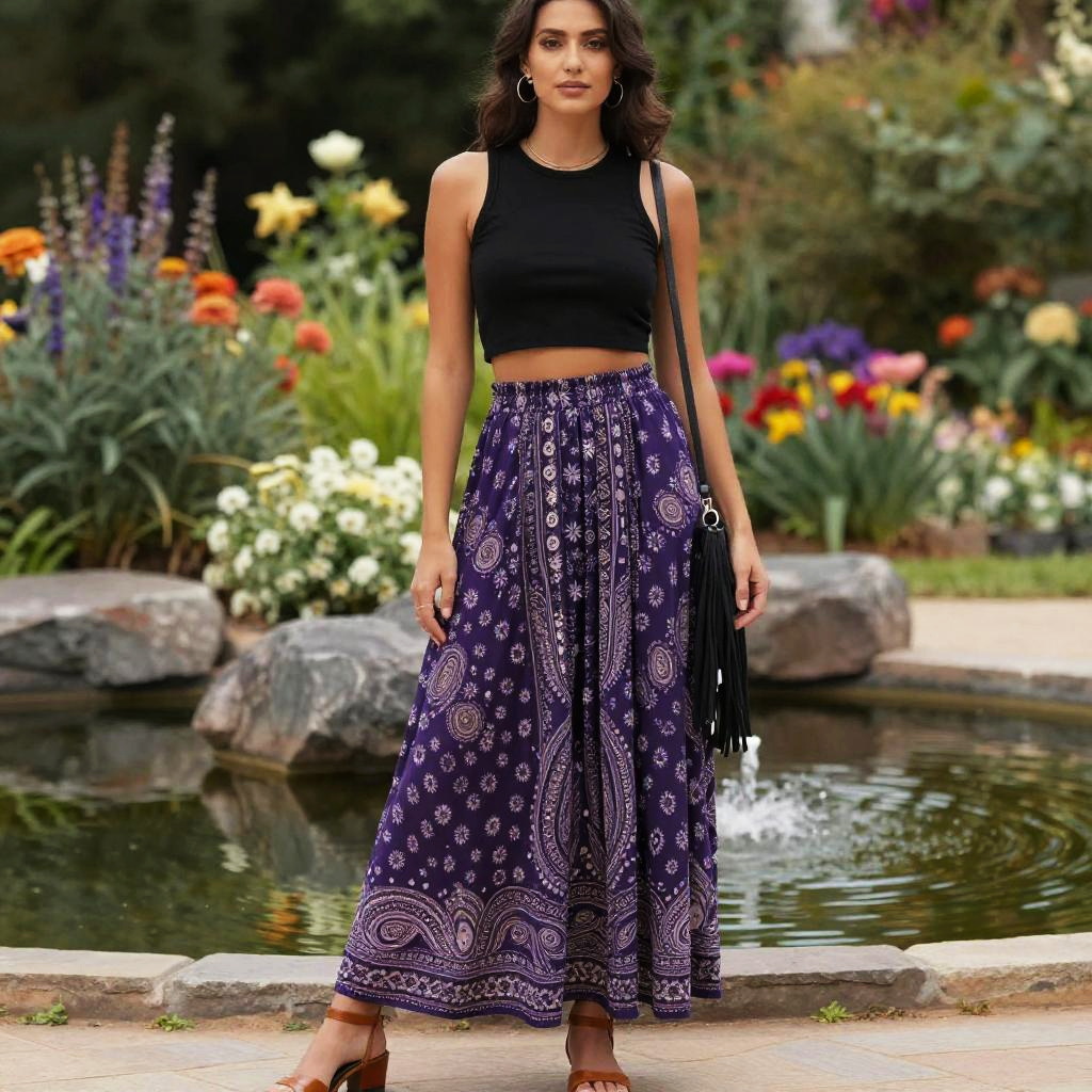 A woman, in a bohemian style, wearing a sleeveless black crop top and a high-waisted purple patterned maxi skirt with paisley designs, brown ankle strap flats, and a black fringe crossbody bag, minimal jewelry, set against a backdrop of a flower garden beside a tranquil pond, in the visual style of a1 pictures. Sexy. Pretty face and beutiful eyes