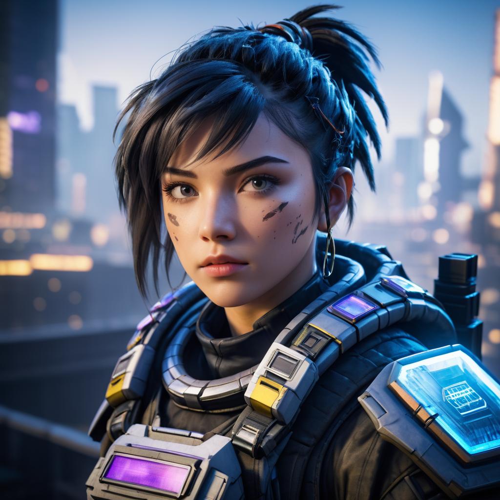 Close-up portrait of a young female Apex Legends character with fierce determination, wearing futuristic tactical armor and gear. She has medium-length black hair styled in an edgy updo with tech accessories. The background shows a detailed futuristic cityscape with tall skyscrapers and atmospheric lighting. The image features cinematic lighting and vibrant colors.