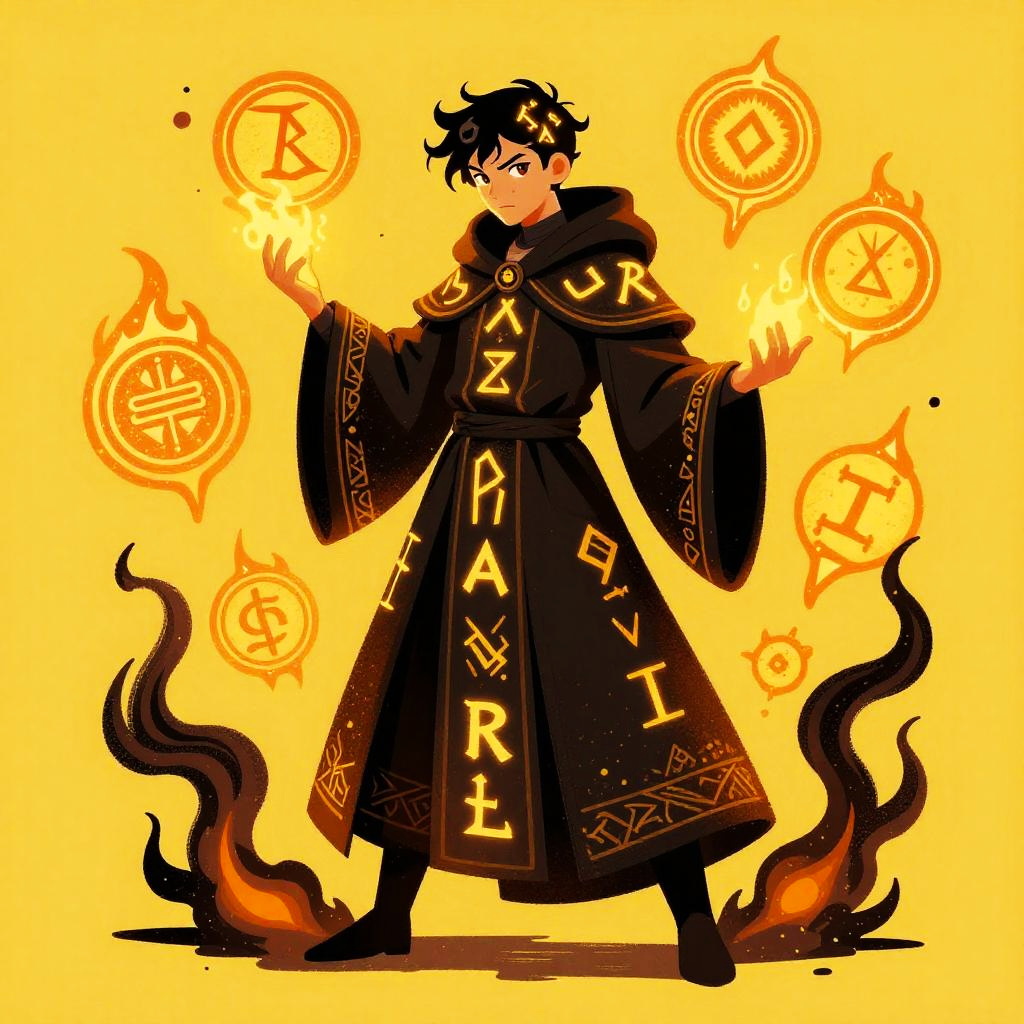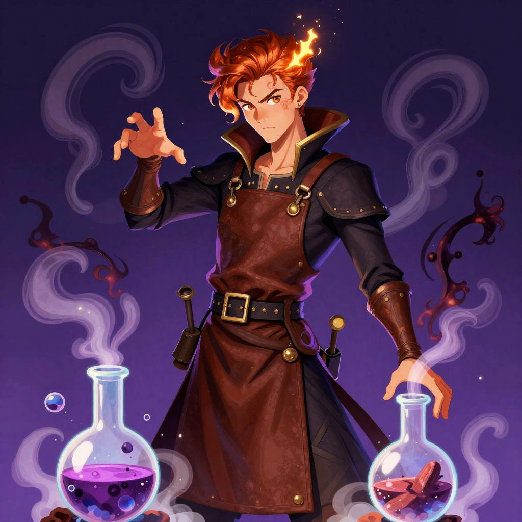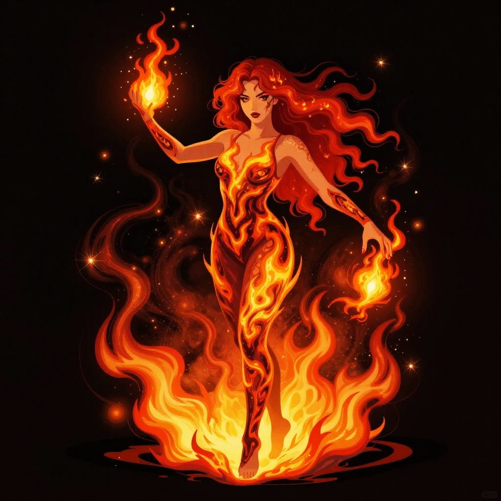 Illustration in pop art style of a mystic flame dancer, full body image, with long wavy crimson hair with flickering embers, wearing fiery patterned silk bodysuit. The character is magically controlling and enchanting whirling trails of burning sparks that dance around her, with dark magic flowing from her fingertips, rendered with vibrant, bold visuals.