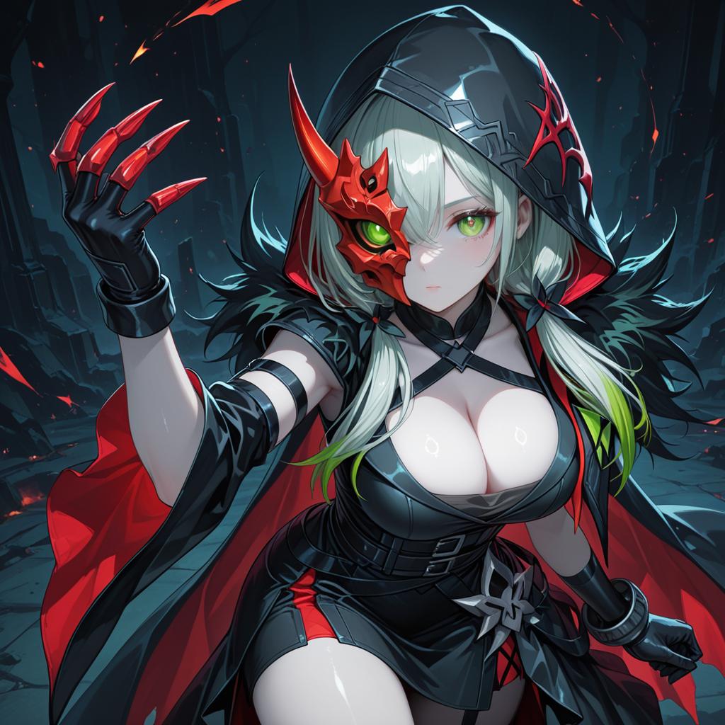 Diabellstar the black witch, yu-gi-oh!, 1girl, pale skin, green eyes, green hair, medium hair, grey hair, large breasts, cleavage, half mask, red mask, dress, hood up, single sleeve, single detached sleeve, duel monster, colored tips, single glove, by artist akaga hirotaka, dark_illustrious