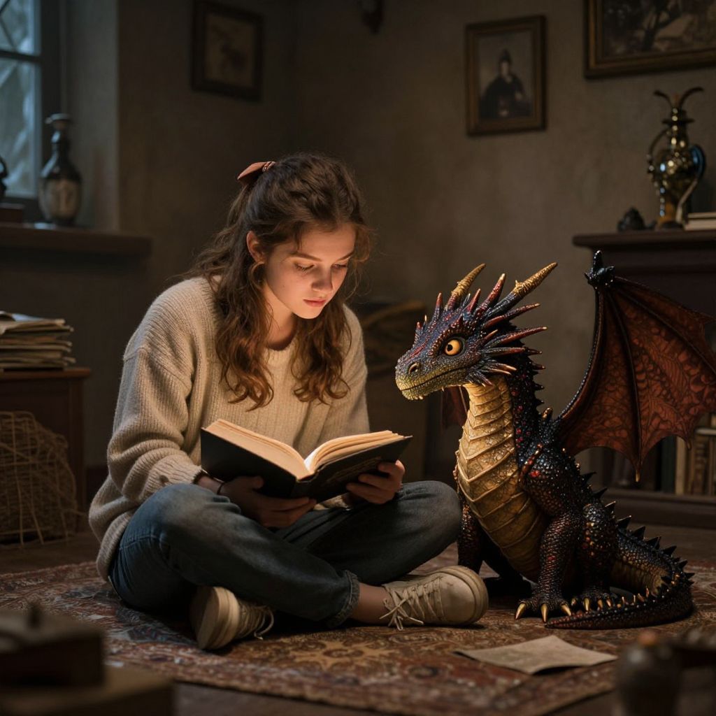 In a quiet corner where past and present converge, a timeless bond forms as a young woman and a curious dragon share the warmth of learning, their shared curiosity illuminating the room with the soft glow of understanding and wonder.