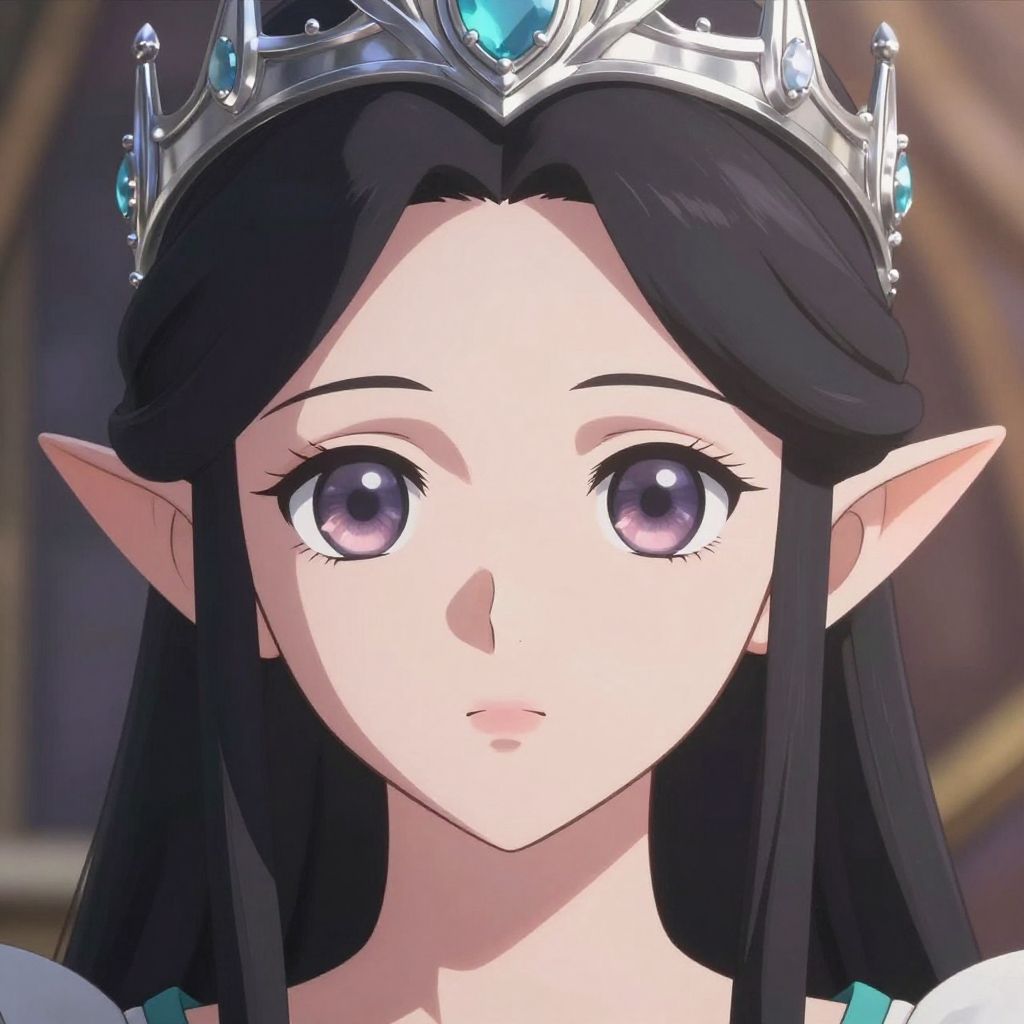 Anime elf base portrait close-up, luminous skin, large expressive eyes, intricate silver crown with gems, fantasy background blurred, soft shadows, high detail anime style