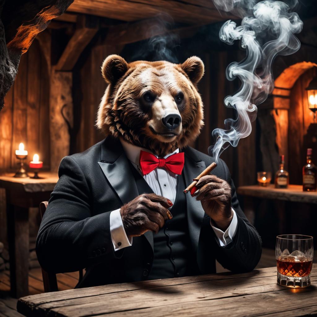 A sophisticated bear character dressed in a black tuxedo with a red bow tie, sitting at a rustic wooden table inside a dimly lit cave, holding a smoking cigar, with a glass of whiskey on the table emitting smoke, warm orange and brown tones, cinematic and moody lighting, detailed fur texture, cozy and slightly mysterious atmosphere