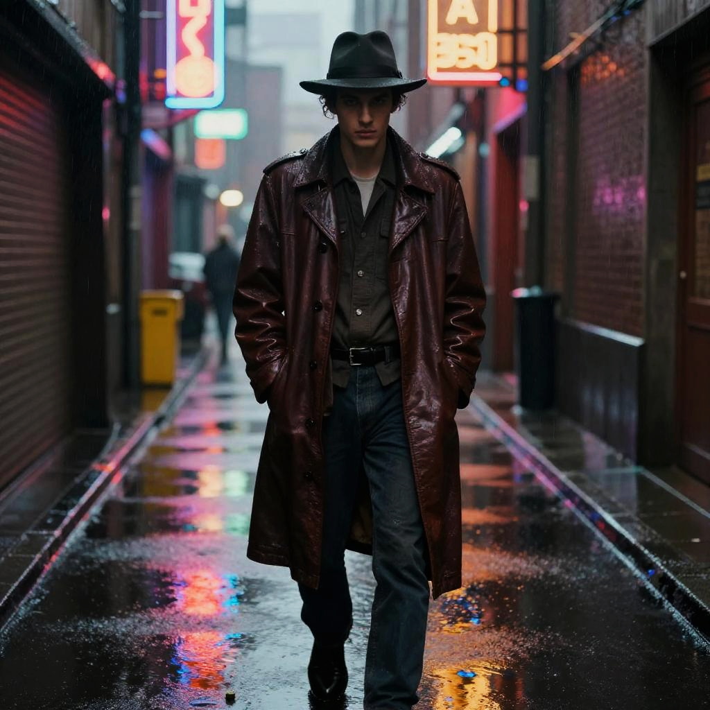 A young man in a leather duster and fedora standing in a rain-drenched neon alley, illuminated by saturated neon reflections and wet-surface glints. The scene evokes a moody, cinematic noir with tension mood, reminiscent of classic film styles, featuring rich colors and deep storytelling elements.