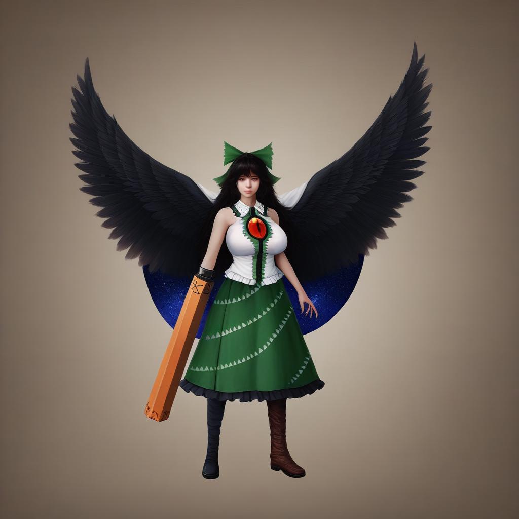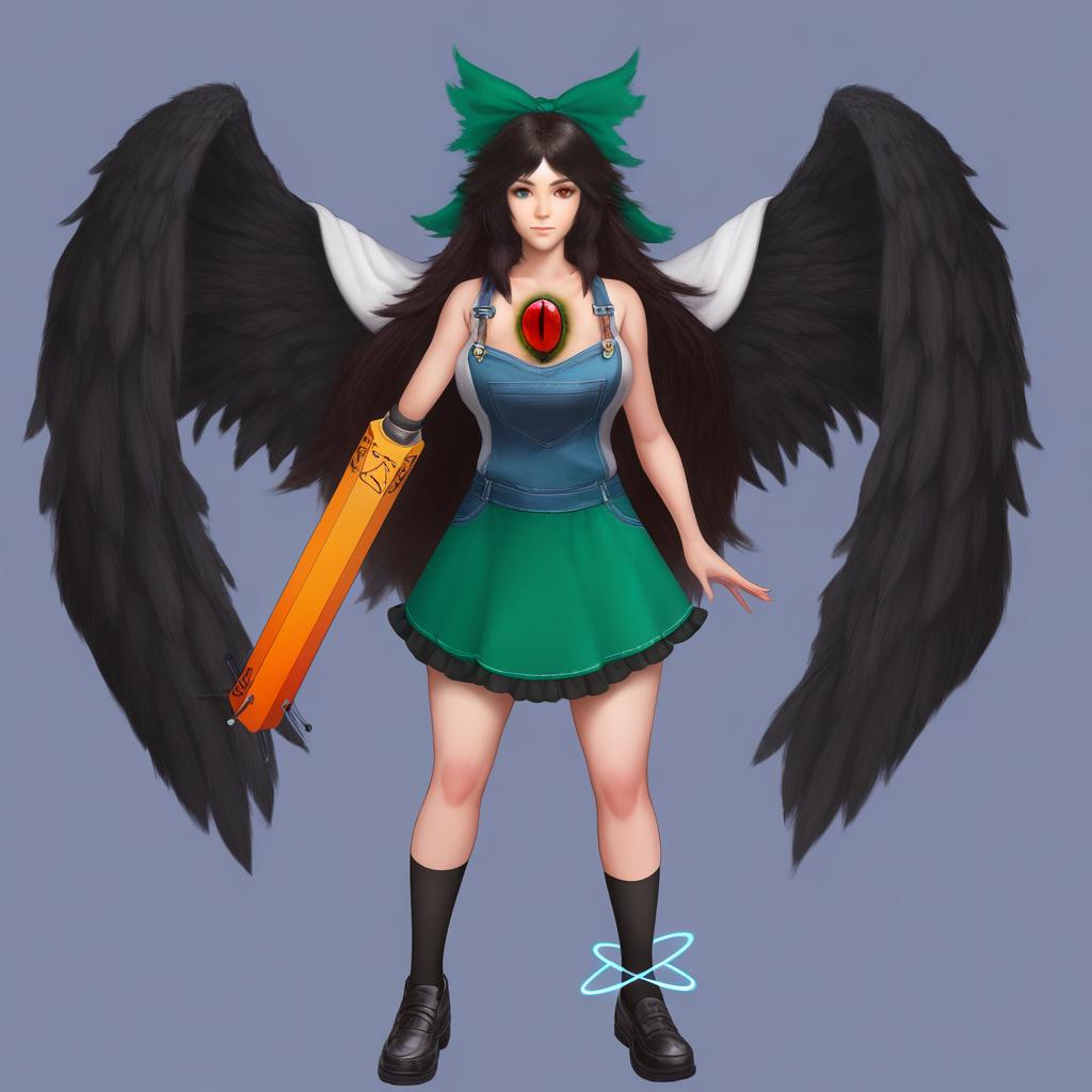 Reiuji utsuho, touhou, 1girl, red eyes, third eye, long hair, black hair, brown hair, hair bow, large breasts, green skirt, green bow, black wings, wings, black wings, arm cannon, full body, 1girl, solo, overalls, delicate woman with long chestnut hair and warm expression, realistic, intricate anatomy, realistic skin tone, casual expression, elegant posture, denim texture, bare shoulders, functional clothing, slender fingers, simple background