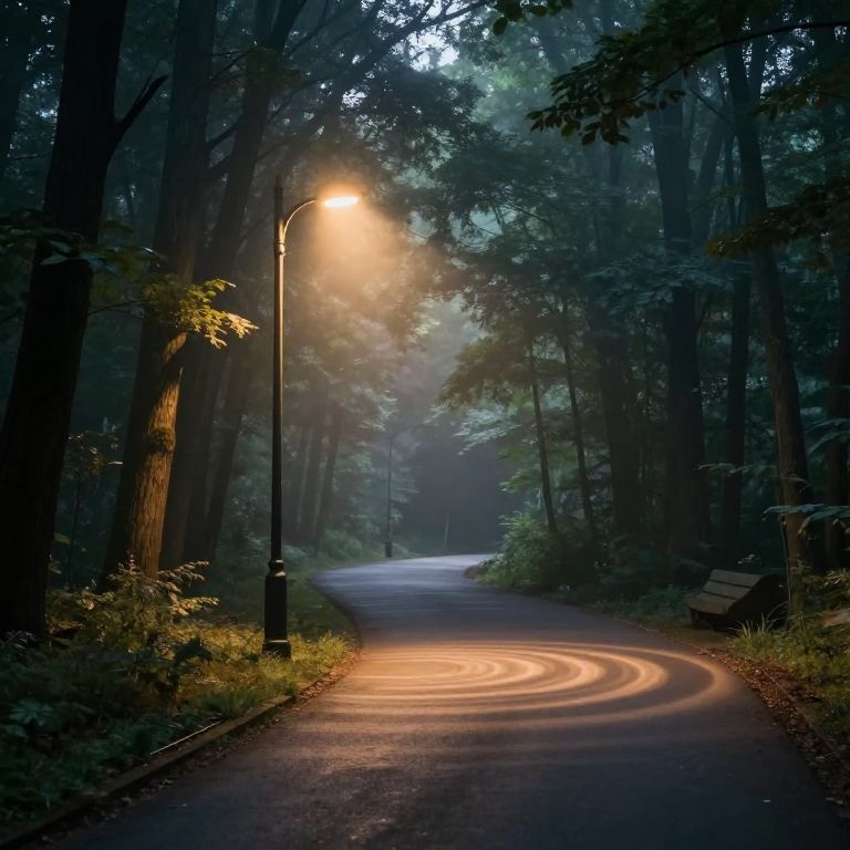 Streetlamp illuminates a serene forest path, casting ethereal concentric rings of light that ripple outward, enveloping the towering trees and misty atmosphere in a timeless, otherworldly glow.