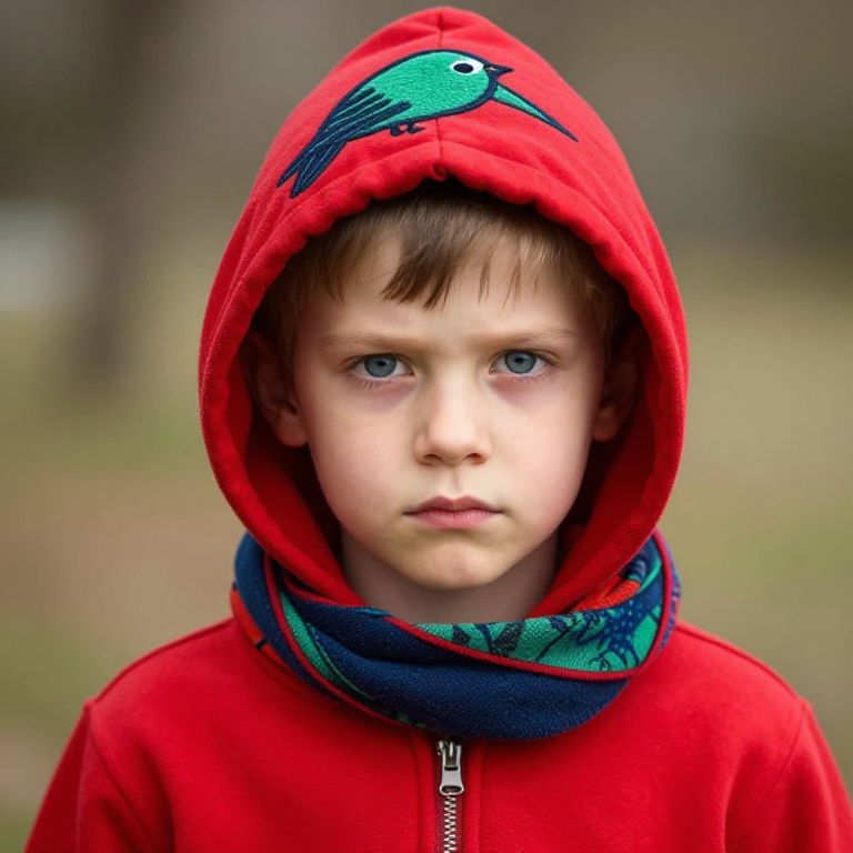 A young boy is wearing a red hooded sweatshirt with a hood and a scarf around his neck. The hood has a bird design on it, and the hood is also red with a green and blue design. The boy has a serious expression on his face, and his eyes are blue.