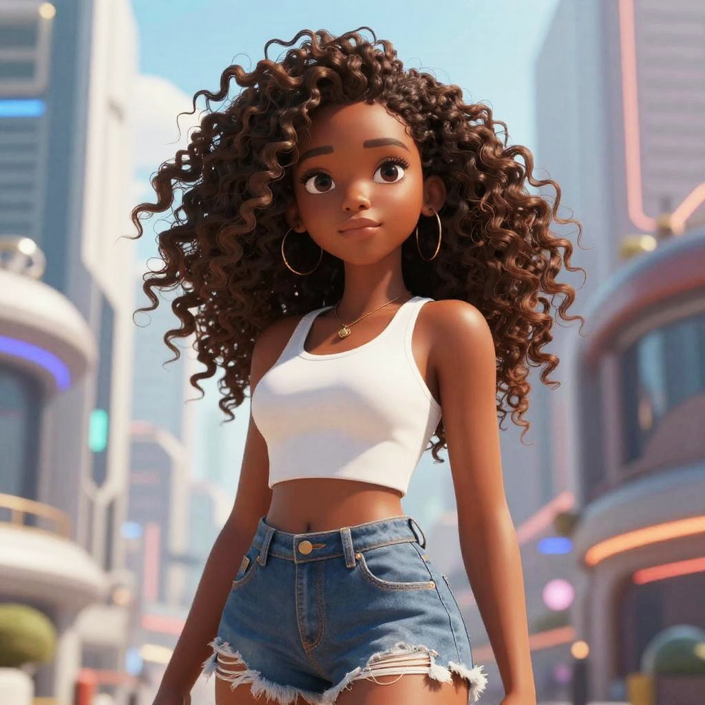 Anime girl with brown skin and voluminous curly hair, standing confidently in a futuristic cityscape, intricate hair curls flowing in the wind, soft shadows emphasizing her features, bright highlights, wearing casual modern clothes, vibrant anime art style.