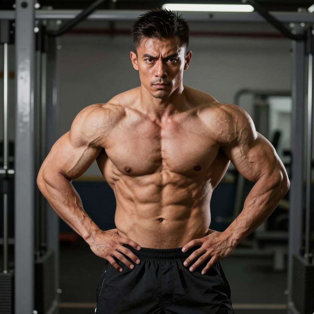 Muscular Asian man with short dark hair and intense expression, covered in sweat, wears a dirty sleeveless shirt and a black strap over his shoulder. He stands facing another muscular person with brown hair, in a dark, smoky indoor gym setting. Man's right hand grips the strap while his left rests on his waist.