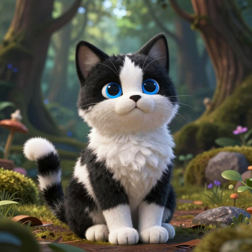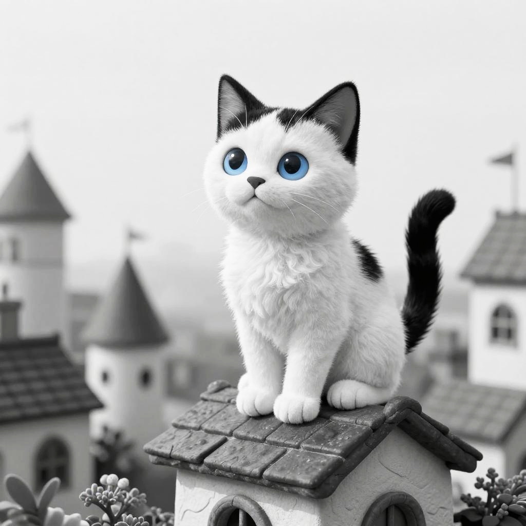 Surreal Black and White Cat with Blue Eyes on Smurf Village Rooftop
