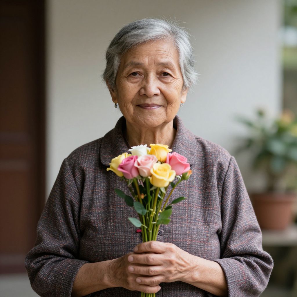 Photograph of an elderly Asian woman with short gray hair, wearing a brown patterned blouse, holding a bouquet of pink and yellow roses, smiling softly