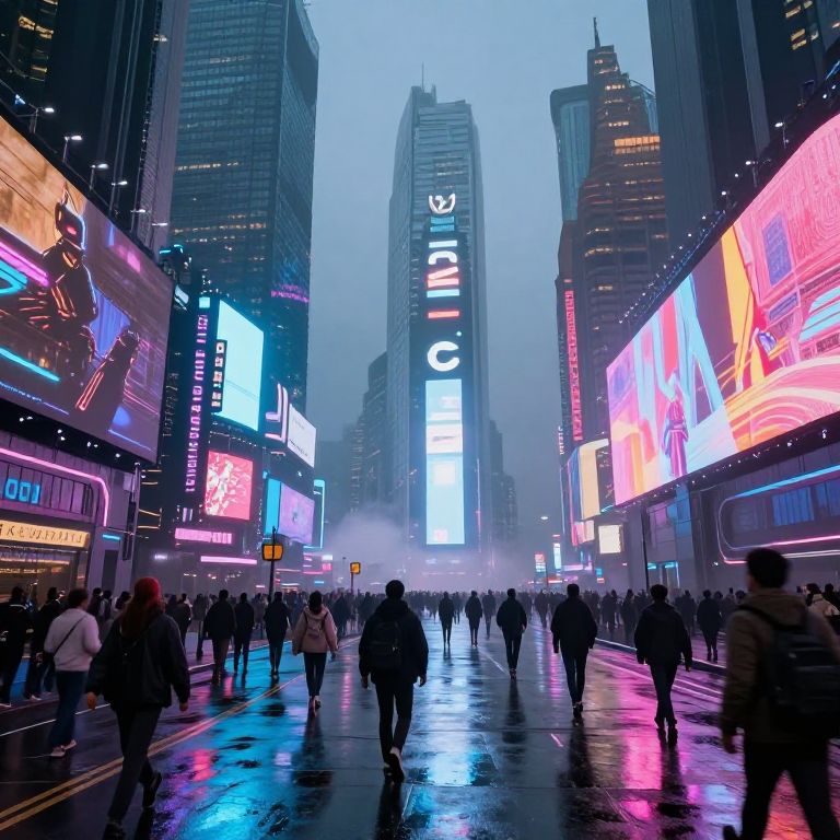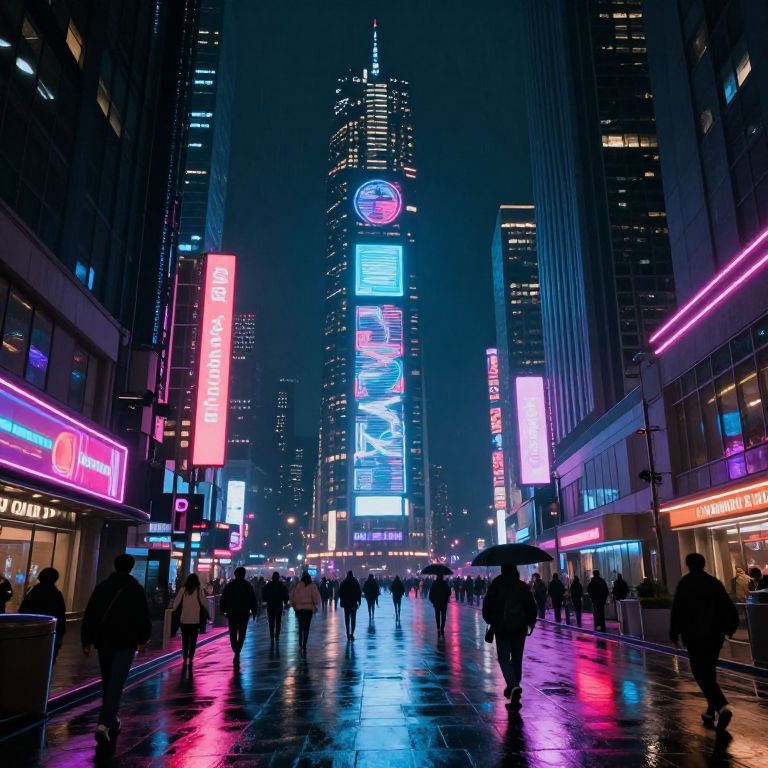 Photograph of a bustling urban street at twilight, flanked by towering, neon-lit skyscrapers with vibrant blue and purple signs, people walking