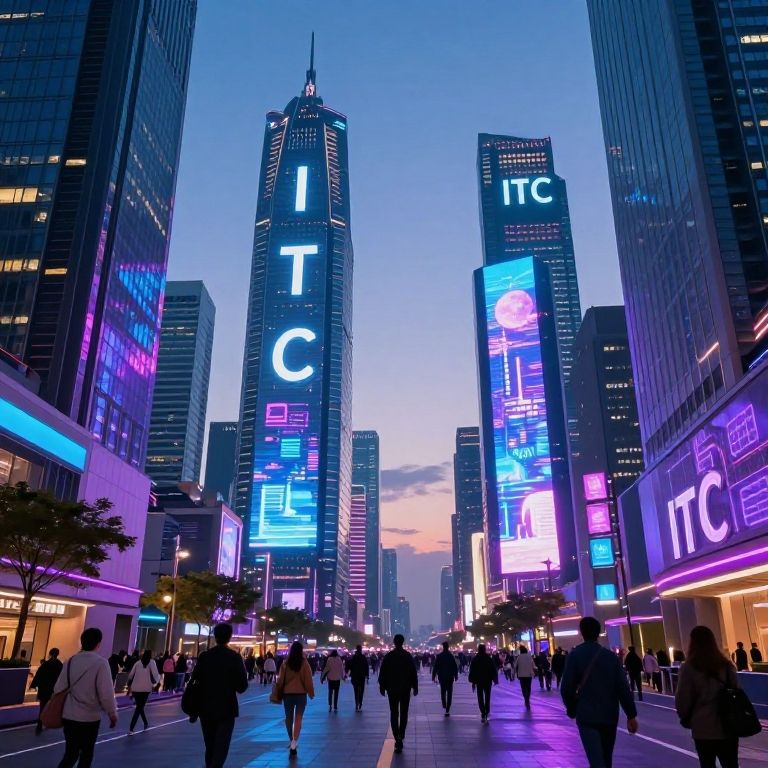 ITC-themed futuristic cityscape at dusk, glowing neon signs displaying the letters ITC, sleek skyscrapers with holographic advertisements, bustling streets filled with diverse pedestrians, cyberpunk aesthetics with vibrant blues and purples, highly detailed.