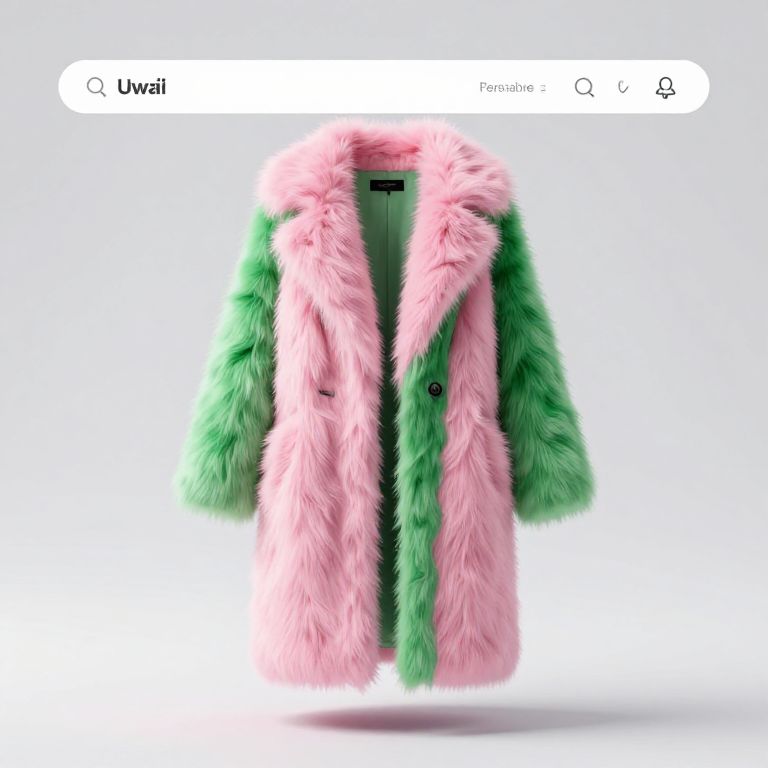 Digital image of a vibrant, pink and green fur coat displayed on a Google search result page, with search bar above.