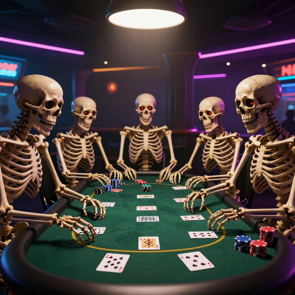A group of skeletons playing poker under eerie neon lights in a modern underground casino, vibrant colors, realistic bones with slight decay, intense expressions with glowing eye sockets, dynamic composition, detailed poker chips and cards, highly detailed scene.