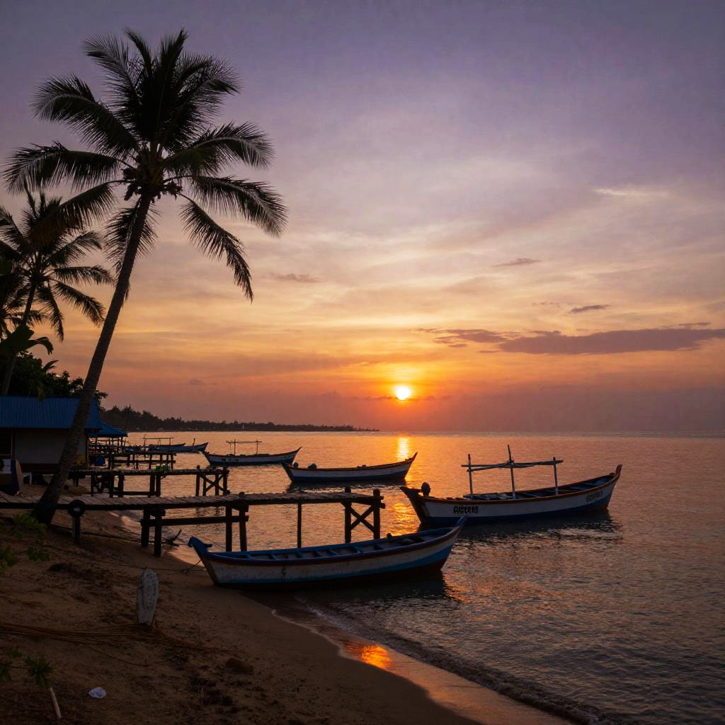 Dominicana coastal landscape at sunset, turquoise waters meeting white sandy beaches, fishermen boats anchored near shore, lush green hills in background, warm golden light reflecting on water, tropical paradise mood, high detail and vibrant colors.