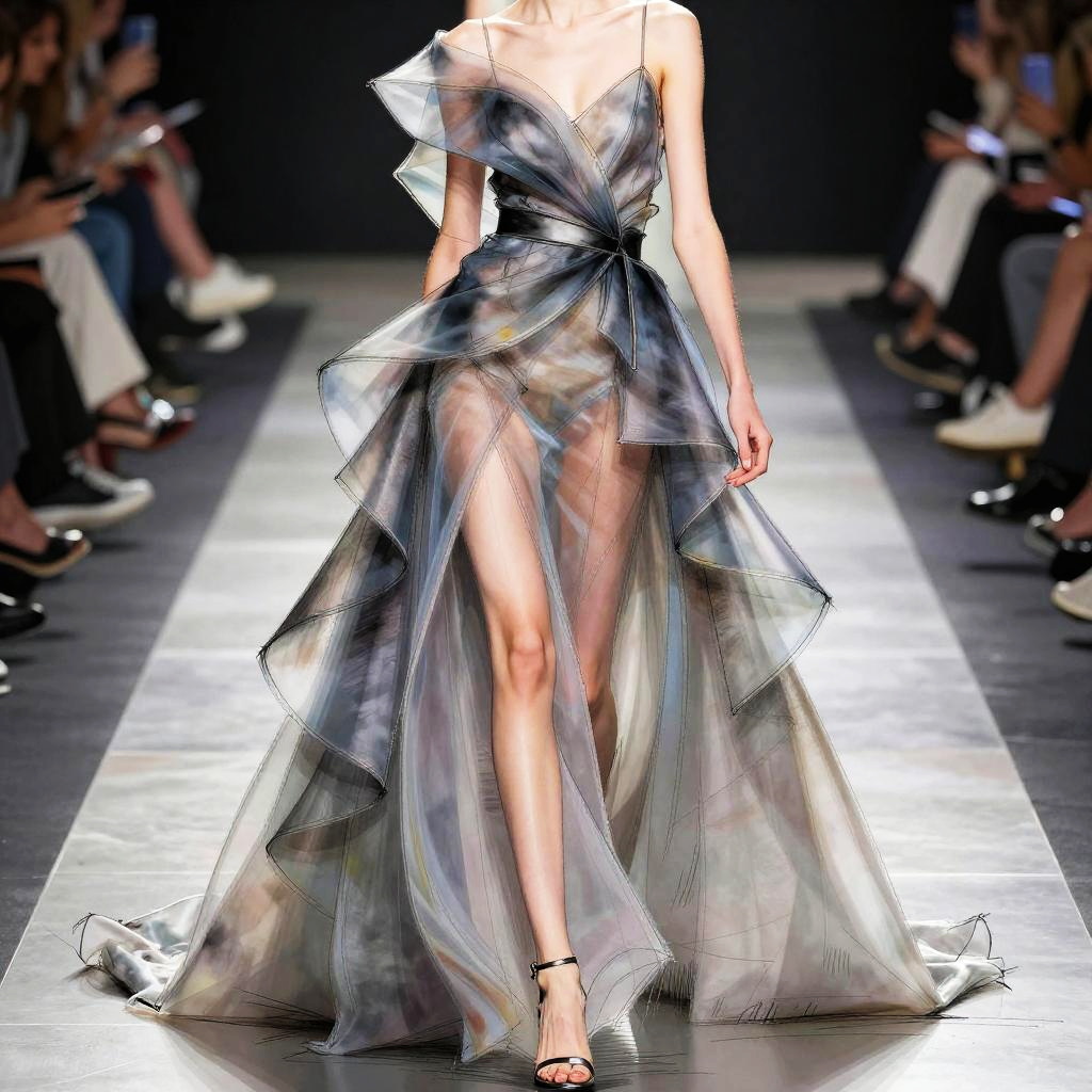 Clothing sketch illustrating a high-fashion runway gown with dramatic layers and flowing fabric, created using digital ink with gradient shading and subtle color accents to capture movement and fabric transparency in a striking composition.