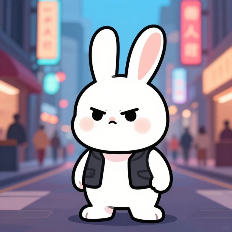 Cartoon white bunny with black vest stands in a neon-lit, bustling urban street, with blurred pedestrians and colorful signs. Digital art.