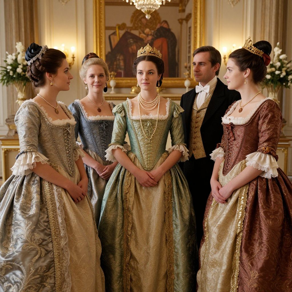 Elegant figures in period attire gather in a grand hall, with a central woman adorned in a green corset dress, gold crown, and pearl necklace, flanked by two women in elaborate gowns and a man in formal wear, all set against a backdrop of ornate decor and warm lighting.