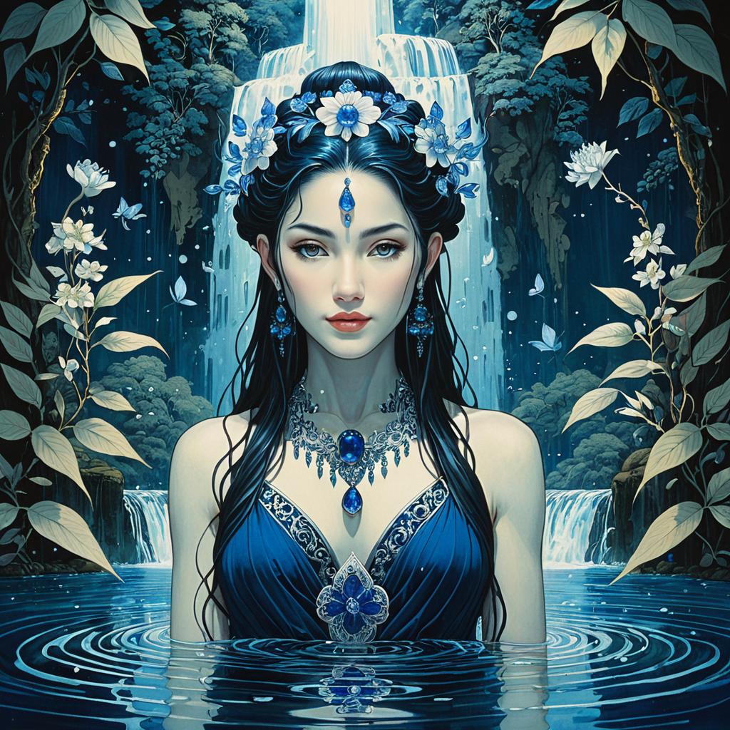 Breathtaking detailed concept art painting of a tranquil waterfall goddess immersed in sapphire waters, orthodox saint with piercing eyes, ornate background, amalgamation of leaves and flowers, by James Jean, Hayao Miyazaki, Miho Hirano, extremely moody lighting, 8k