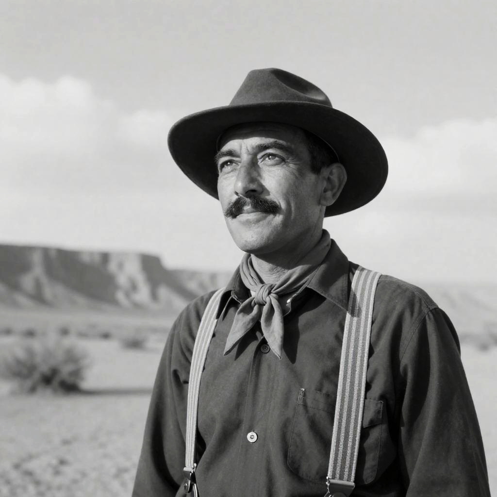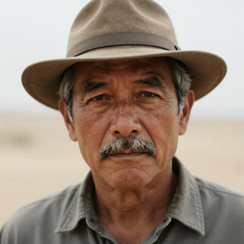 Photograph of an older white man with a gray mustache, wearing a beige wide-brimmed hat and brown fringed coat, against a desert backdrop with a blurred mountain and a teepee in the background. He has a stern expression.