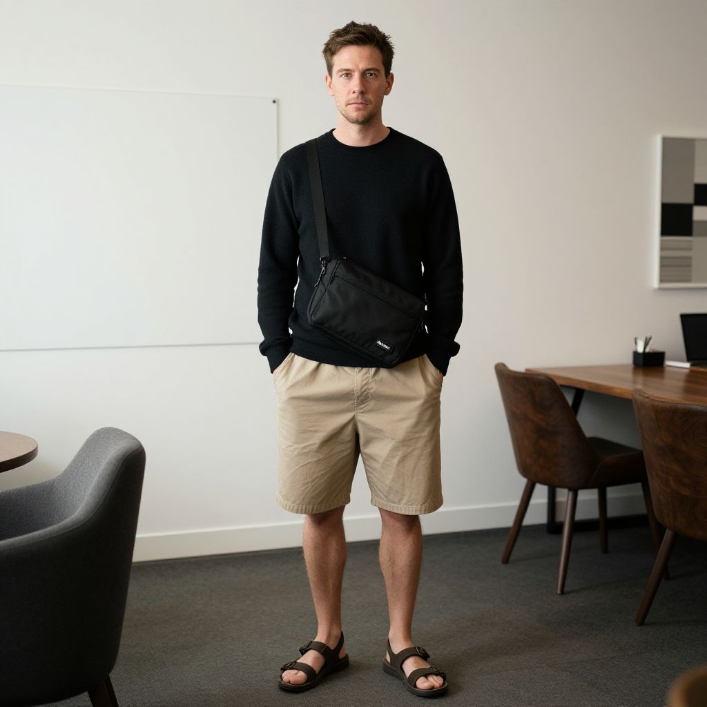 A man, charcoal fleece pullover, moisture-wicking black long-sleeve shirt, relaxed-fit khaki shorts, versatile dark brown sandals, sleek black messenger bag, tech hub atmosphere, whiteboard walls, cozy lounge areas, 3M ferrania analog film stock, focused expression. Man has masculine face and piercing eyes