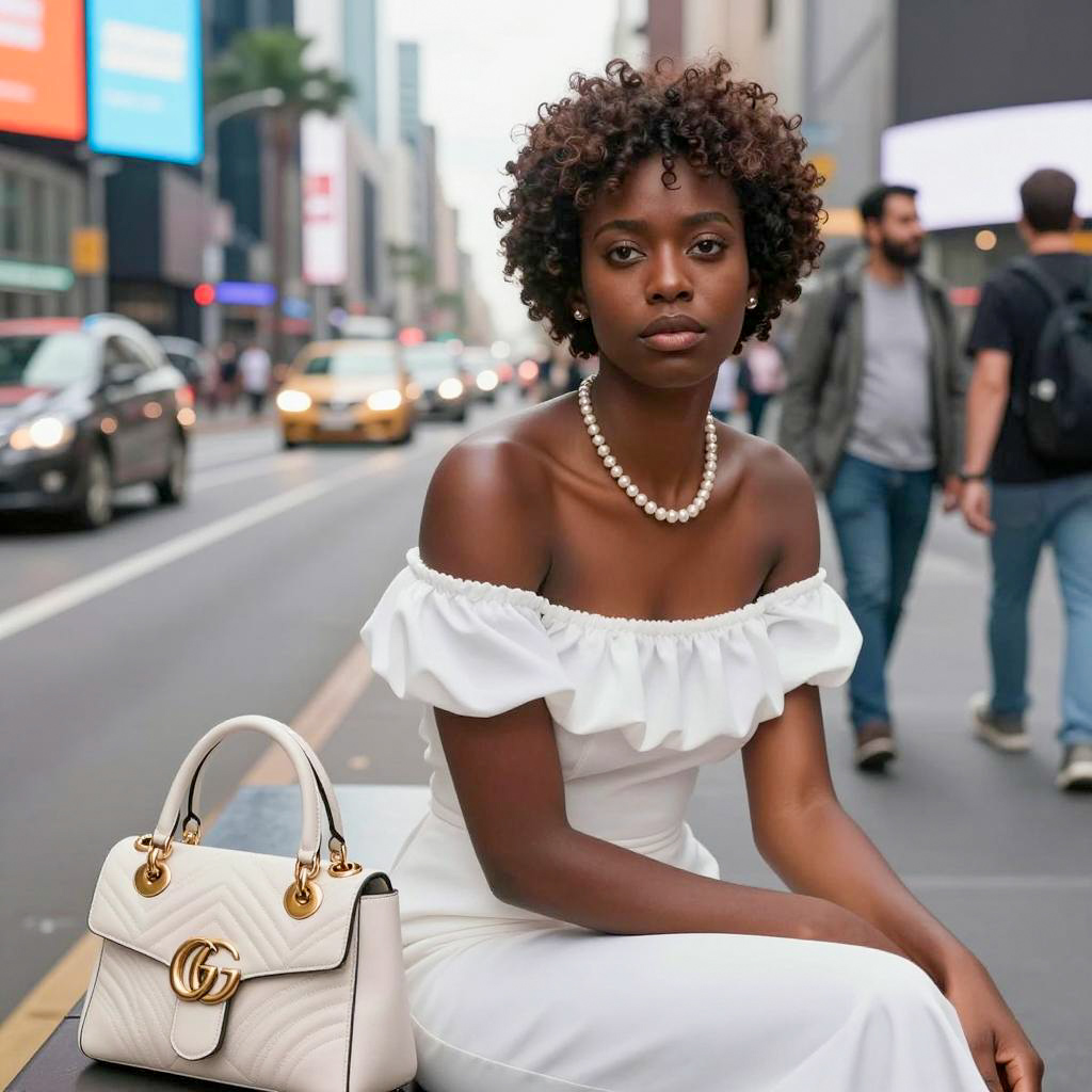 Three Black women standing on a city street during daylight. The woman on the left wears a white off-shoulder top and high-waisted brown velvet pants. The woman in the center is dressed in a red lace jumpsuit with a black crossbody bag. The woman on the right sports a yellow oversized shirt with a black and white patterned crossbody bag and long braided hair. The urban background features buildings and cars, with a clear blue sky overhead. All three women look back over their shoulders with confident postures.