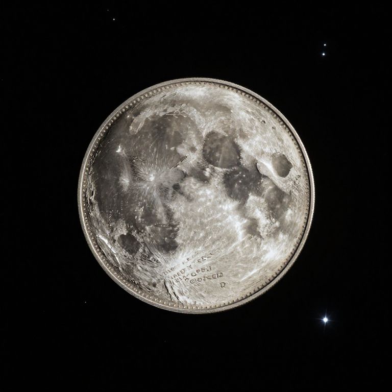 A moon-sized coin spins slowly in the void between stars, occasionally flickering with messages in forgotten civilizations’ languages, lost to time.
