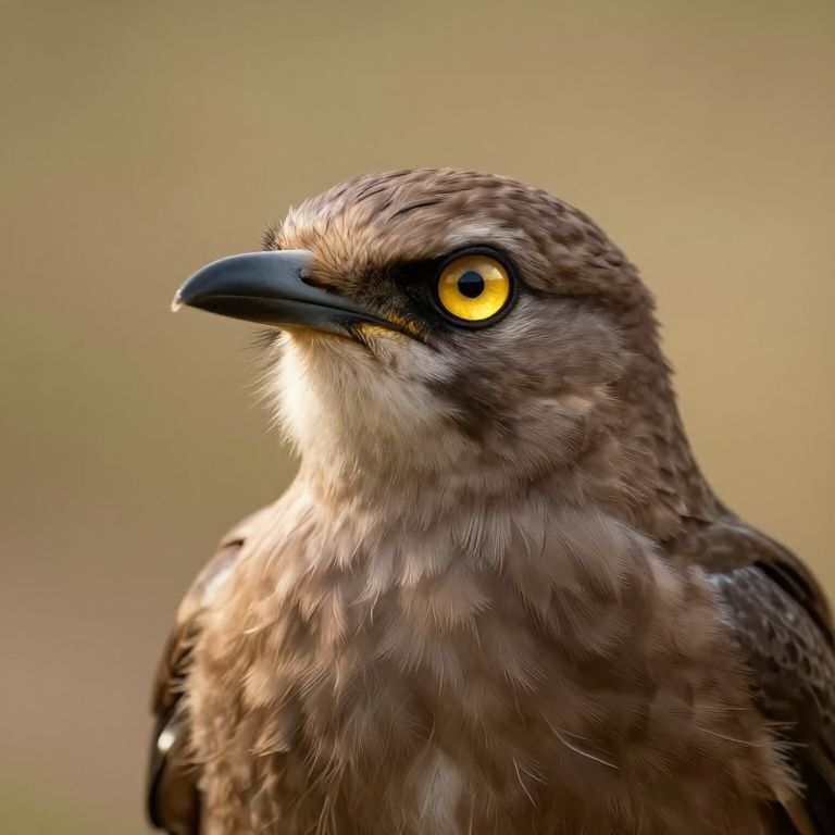 Close-up photograph of a brown hawk with striking yellow eyes and a sharp, black beak. The bird's feathers are detailed with various shades of brown and white, and the light highlights its soft, textured plumage. The background is a blurred, gradient beige, keeping the focus on the hawk's intense gaze and elegant features. The hawk's head is slightly tilted to the left, showcasing its side profile. The image captures the bird's natural beauty and alertness.