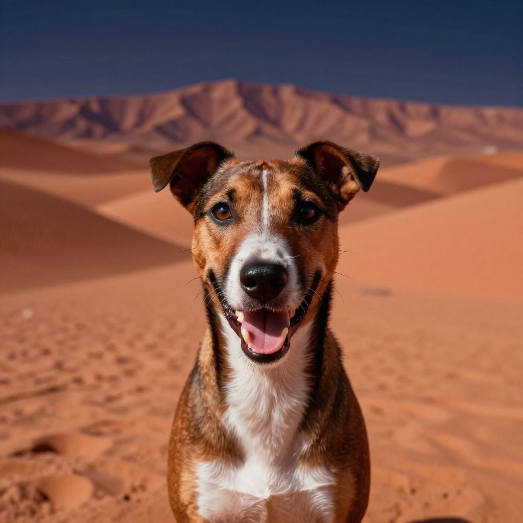 Photograph of a brown and white mixed-breed dog with black ears standing in a desert. The dog has a black nose, white chest, and is smiling with its mouth open, showing a pink tongue. Its eyes are blue and it has a short coat. The background features rolling, orange sand dunes under a deep blue sky. The dog is centered in the image, with the dunes extending to the horizon. The lighting is bright, highlighting the dog's fur and the texture of the sand.