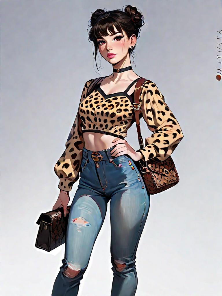 Digital illustration of a fashionable woman wearing casual streetwear. She has long black hair, hoop earrings, and is dressed in a white long-sleeve top with a green geometric pattern on the front, light wash high-waisted distressed denim jeans, and black sneakers. She carries a small black handbag and stands against a stylized circular background with blue and pastel color accents.
