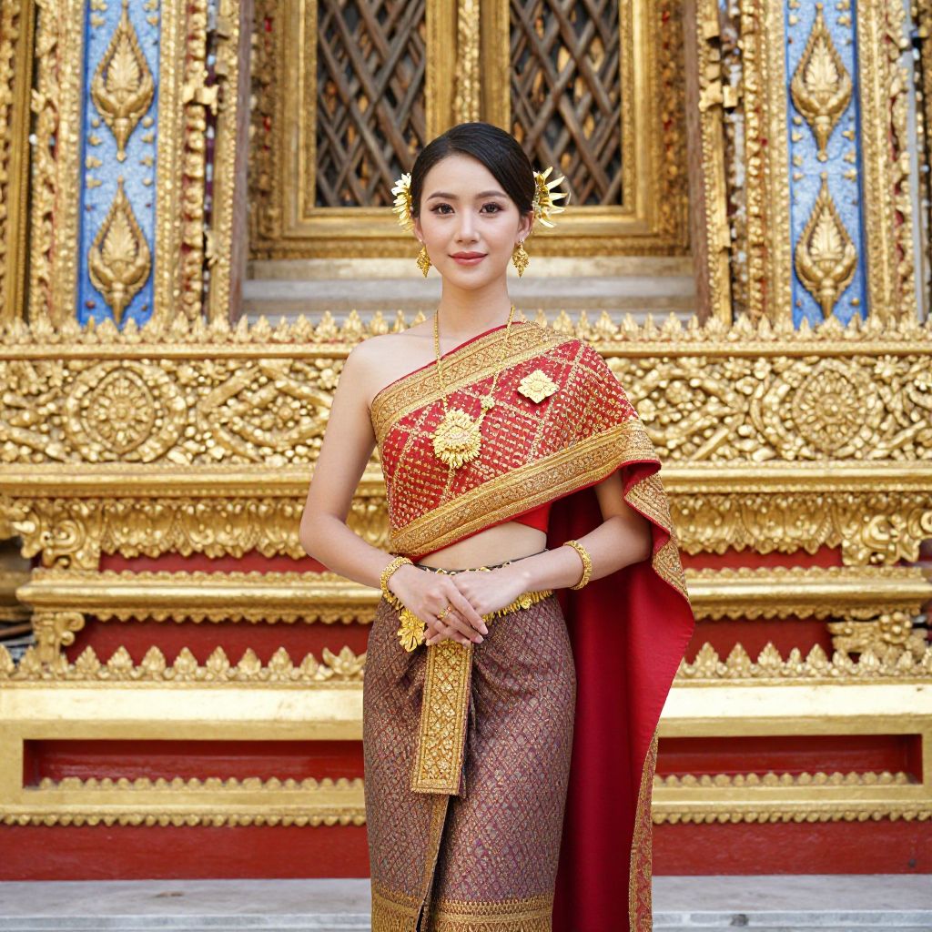 Photograph of an Asian woman with black hair in a traditional red and gold Thai silk sari, standing in front of an ornate, gold-