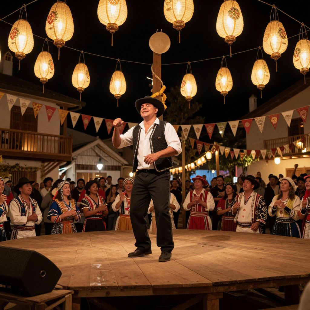 Man performing traditional dance on a rustic wooden stage at night during a lively village festival. The scene is illuminated by warm glowing lanterns hanging overhead. The background features festive bunting and a crowd of people dressed in colorful traditional costumes, clapping and enjoying the celebration. The atmosphere is vibrant, capturing the cultural spirit and joyous mood of the event.