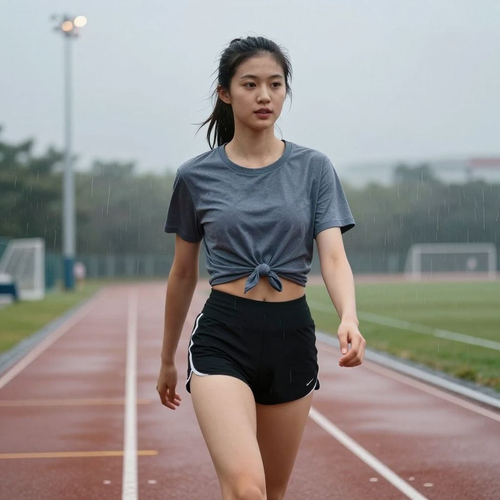 Photograph of an athletic Asian woman with black hair in a ponytail, wearing a blue and pink sports bra, and orange leggings, standing confidently on