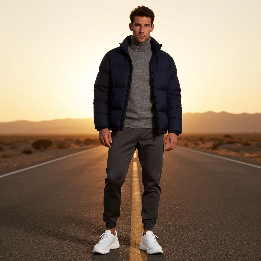 A man, navy blue puffer jacket, tailored grey joggers, chunky white trainers, soft cashmere turtleneck, modern athleisure look, sunset glow, endless asphalt, distant mountains, sepia effect, relaxed expression. Man has masculine face and piercing eyes