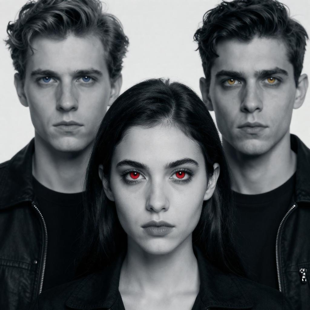 Digital portrait of three people with intense expressions. Central woman with red eyes, dark hair, and intense gaze. Two men behind her, one with blue eyes and the other with yellow eyes. Monochromatic blue and white color palette. All wear dark clothing. Background is plain white.