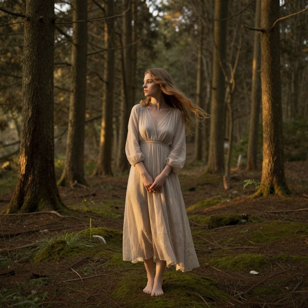 Demure pose captured in a serene forest clearing at golden hour, a woman with flowing hair wearing a light, ethereal dress, standing barefoot on moss, hands delicately clasped, soft warm light filtering through tall trees, peaceful and calm demeanor.