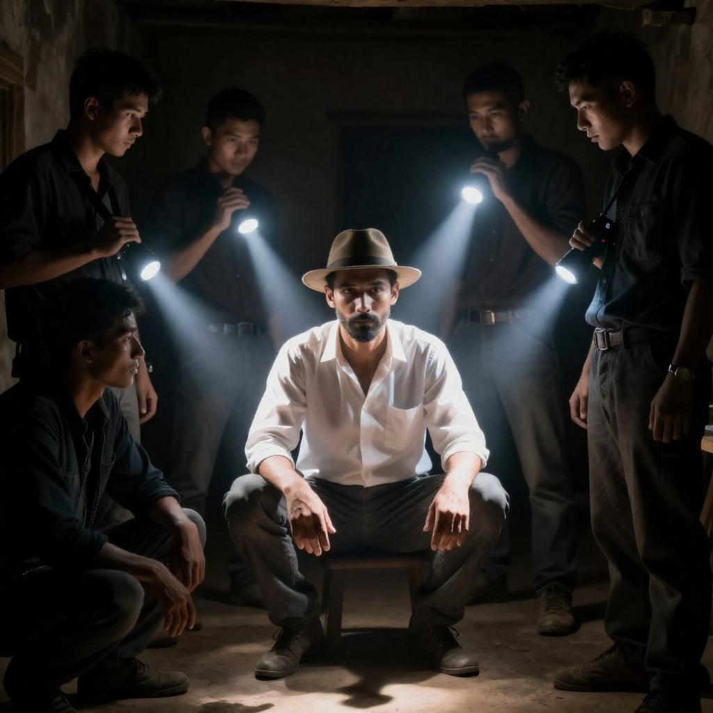 Photograph of a dimly lit, rustic room. A young man with short dark hair, wearing a dark shirt, kneels by a glowing lantern, illuminating a person lying on the floor. A second person in a red shirt stands in the shadowy background. Stone pillars and dark wooden beams frame the scene.